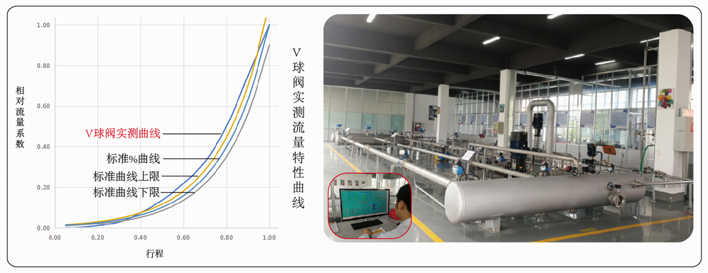 萊克通過不斷改變開口形狀,在實驗室反復測試,再修正曲線,讓V球閥的實測流量特性曲線接近理想%曲線,從而獲得和調節閥一樣的調節性能,但是其流通能力比同口徑調節閥大30-40%。