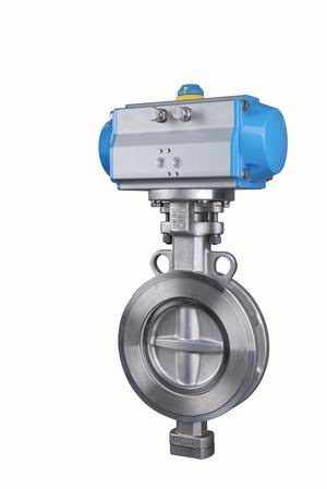 氣動調節蝶閥是一種在垂直于通道的固定軸上旋轉的閥門(閥板)。它由活塞式雙作用或單作用(彈簧復位)氣動執行器和蝶閥組成。屬于旋轉式高性能調節或切斷閥。它配有電動、空氣閥或電磁閥、空氣過濾器減壓器和限位開關(閥位報警器),可實現過程管道中流體介質的比例調節和兩位切斷控制,從而實現流體介質的流量和壓力。