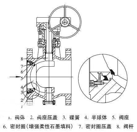 進(jìn)口偏心半球閥密封副的特點(diǎn)是閥門(mén)關(guān)閉時(shí),閥座壓蓋壓緊碟簧,由碟簧推動(dòng)密封壓蓋和閥座向半球體壓緊,并使碟簧在設(shè)計(jì)變形范圍內(nèi),使密封副之間的作用力達(dá)到密封必須比壓,真空技術(shù)網(wǎng)認(rèn)為這樣可以保證閥門(mén)在低壓時(shí)不發(fā)生內(nèi)漏現(xiàn)象。在閥門(mén)啟閉過(guò)程中,閥座、密封壓蓋和密封圈作為一個(gè)構(gòu)件隨著半球體開(kāi)啟角度的變化在管道軸線方向適量懸浮移動(dòng),在介質(zhì)壓力作用下向半球體壓緊,其向閥瓣壓緊的作用力隨著介質(zhì)壓力的升高而增大,從而達(dá)到自密封效果。