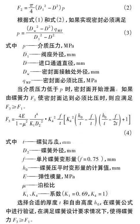 (1) 密封預(yù)緊力。通過(guò)螺栓產(chǎn)生一定的預(yù)緊力,再由閥座壓蓋傳遞給碟簧,使得碟簧產(chǎn)生變形。為了延長(zhǎng)碟簧使用壽命,碟簧的變形量不能超過(guò)自由高度的75%,通過(guò)系列力的傳遞使密封副達(dá)到設(shè)計(jì)的密封比壓。