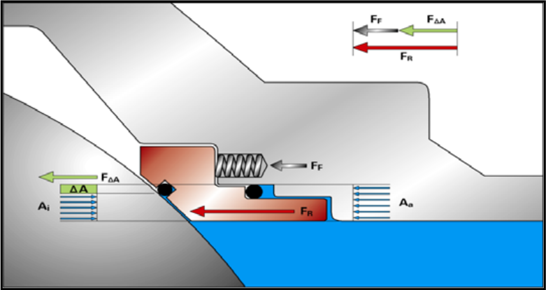 下游自泄放設計球閥現(xiàn)主要用于液體管道,因此本文主要針對在氣體管道中應用較廣的雙活塞效應(DPE)設計球閥進行分析。由附圖 2.1 與附圖 2.2 可見,以雙活塞效應結構(DPE)閥座為受力分析對象,干線壓力與閥腔壓力對閥座的作用力 FR= FF+ F△A,所受合力 FR 方向始終指向閥座,即干線與閥腔壓力均使閥座密封圈向球體壓緊,始終實現(xiàn)球閥閥座良好密封。